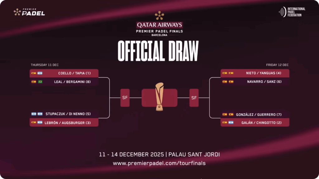 أصبحت نهائيات بطولة بريمير بادل للبادل وشيكة. فبدءاً من يوم الخميس المقبل، يتنافس أقوى اللاعبين في العالم على اللقب الأكثر قيمة، وهو اللقب الذي توج به العام الماضي الثنائي سانز-نيتو وسانشيز-خوسيماريا